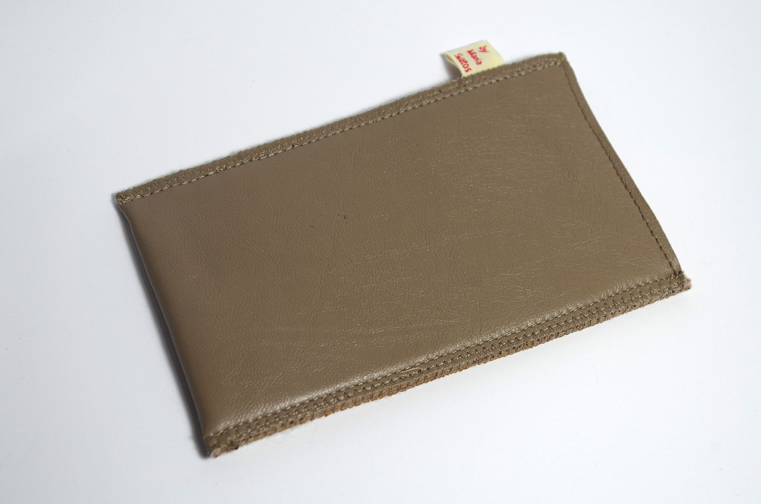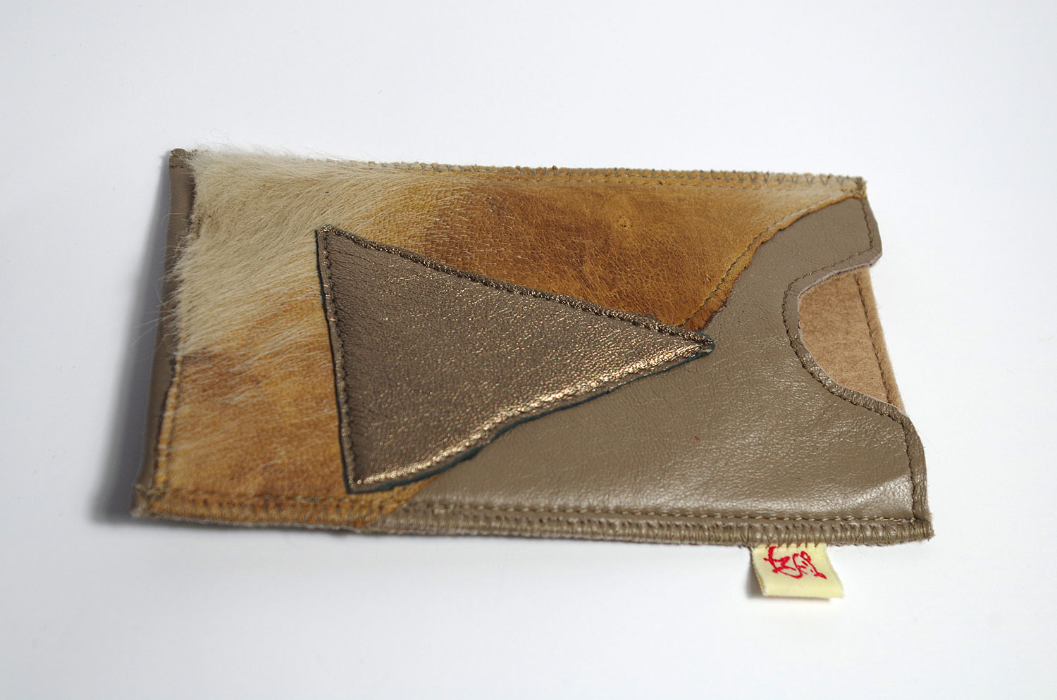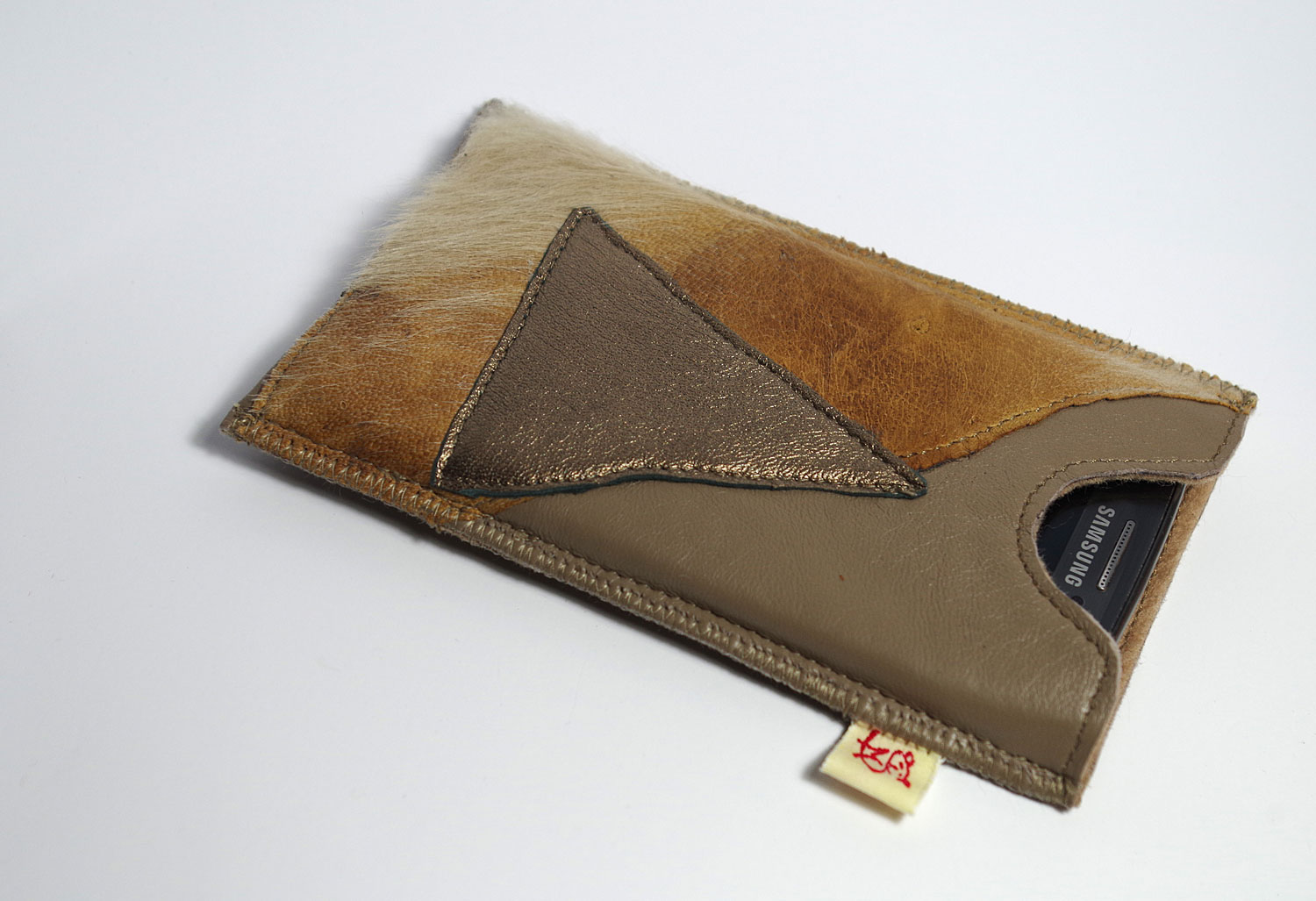 Handytasche aus taubefarbenem Leder 1,2 mm, mit Ablaktationen aus Kuhfell und goldfarbenem Leder, innen mit beigen 2 mm Wollfilz gefüttert.